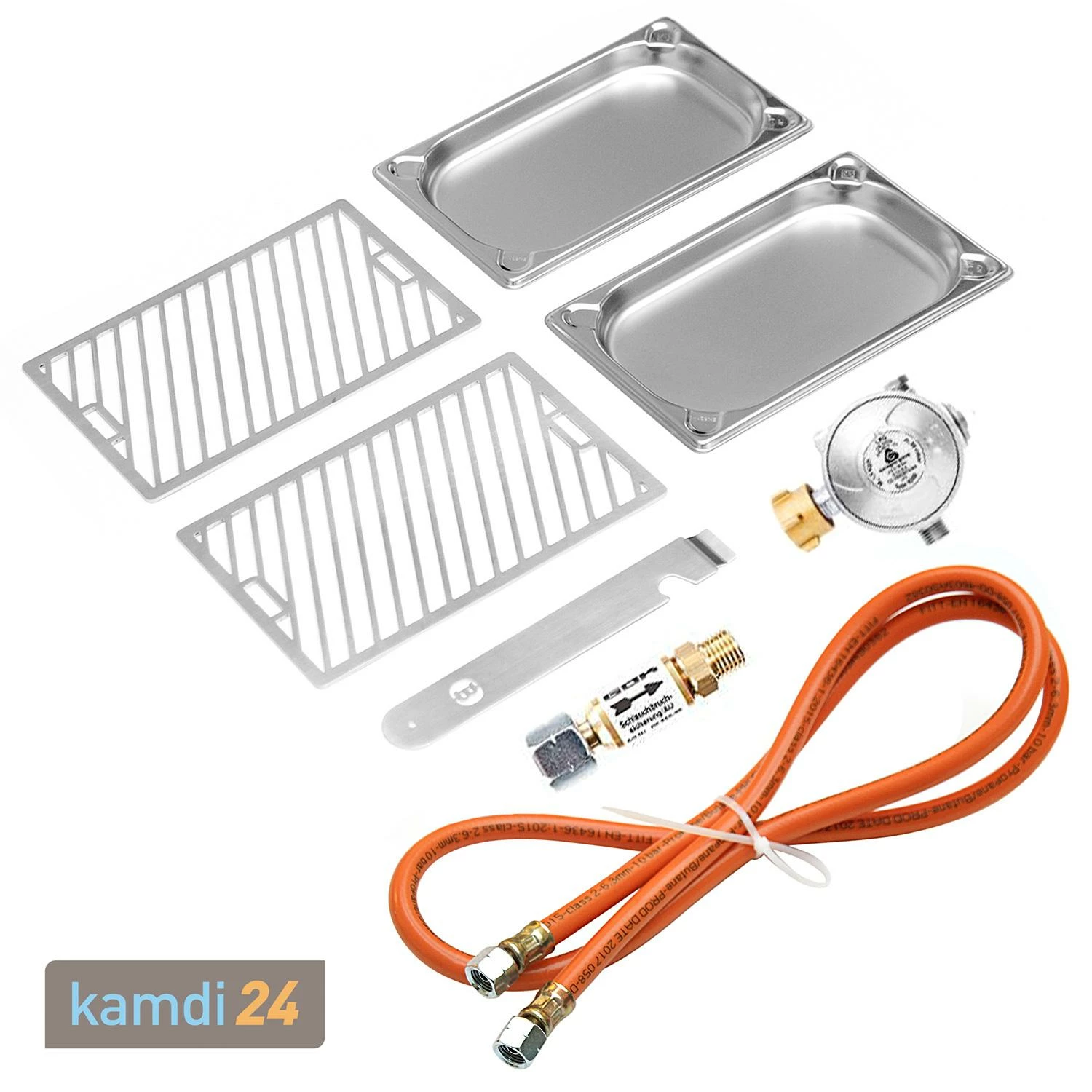 Damit Sie direkt losgrillen können, bringt das wichtigste Zubehör gleich mit: Ein Gasschlauch (1,5 m), ein Druckregler, eine Schlauchbruchsicherung, zwei Grillroste, ein Grillrostgriff, zwei Gastroschalen und eine AAA-Batterie sind im Lieferumfang enthalten.