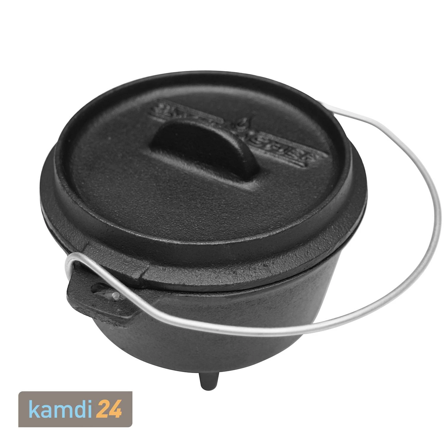 Der eignet sich nicht nur zur Zubereitung von Suppen oder Eintöpfen – Sie können darin nahezu alle denkbaren Gerichte kochen, braten, backen oder grillen. Der dicht schließende Deckel ermöglicht einen Backofen- und Schnellkochtopf-Effekt, wenn Sie darauf glühende Kohlen platzieren. Die gleichmäßige Wärmeverteilung in den massiven Gusseisen-Wänden sorgt für kurze Garzeiten.