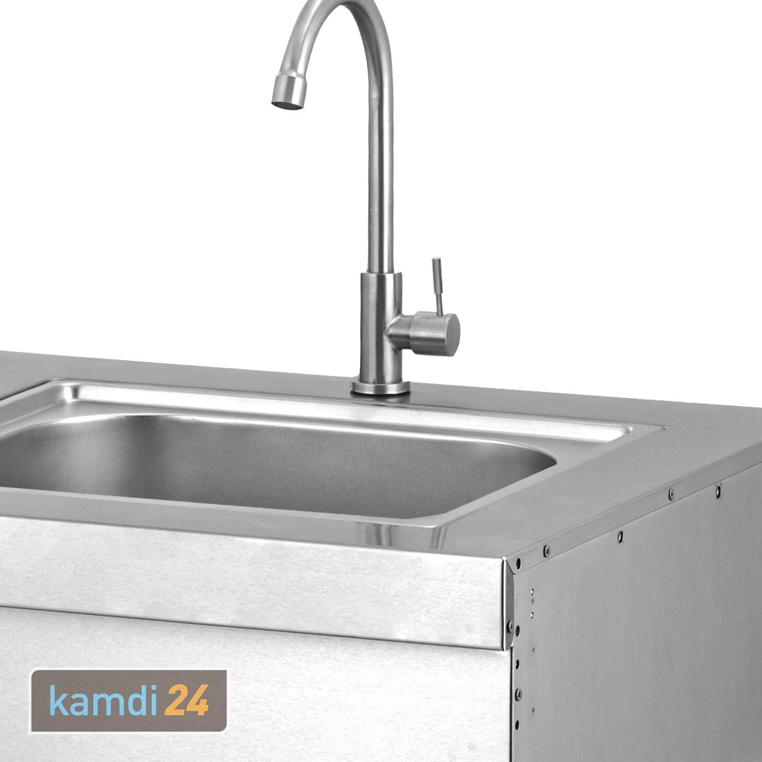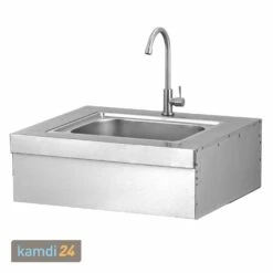 Erweitern Sie Ihre Outdoorküche um das praktische von und verlegen Sie damit auch den Abwasch unter freien Himmel! Das Spülbecken aus verfügt über einen Wasserhahn und Ablauf. Mittels eines handelsüblichen Gartenschlauches erfolgt der Frischwasseranschluss zum Wasserhahn.