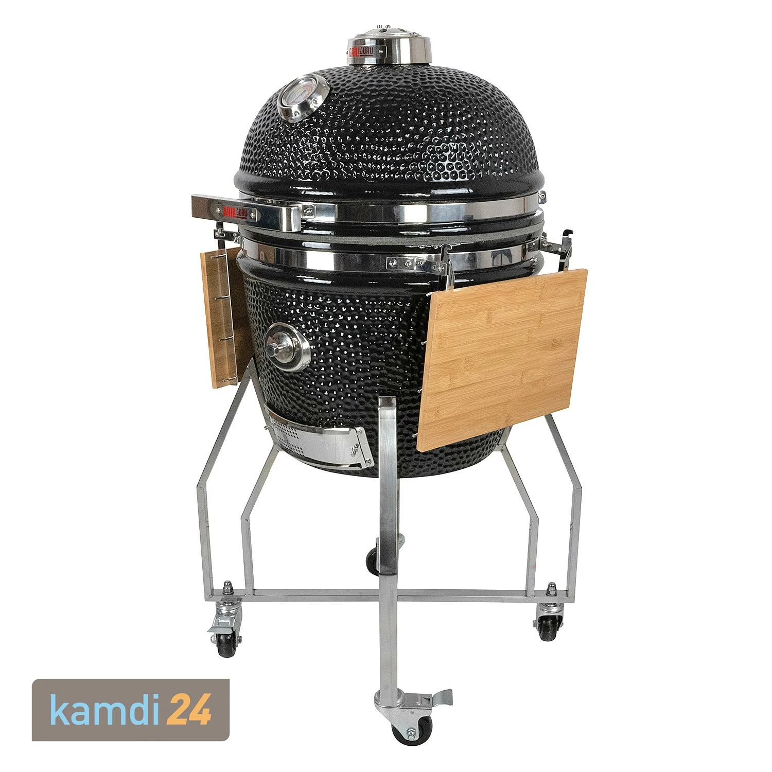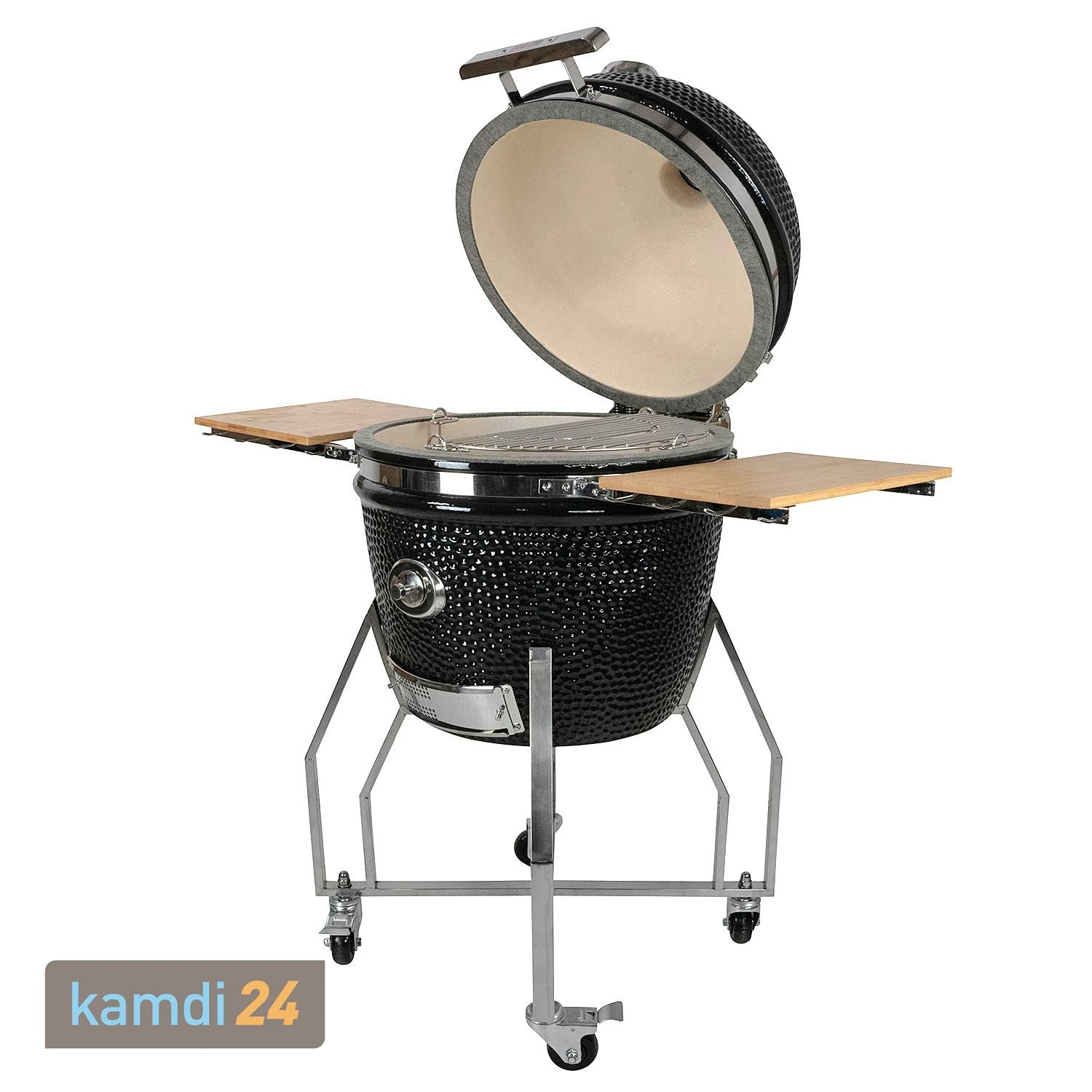 Das pulverbeschichtete Gestell aus Stahl des Keramikgrills eignet sich für den Einsatz zu jeder Jahreszeit.
