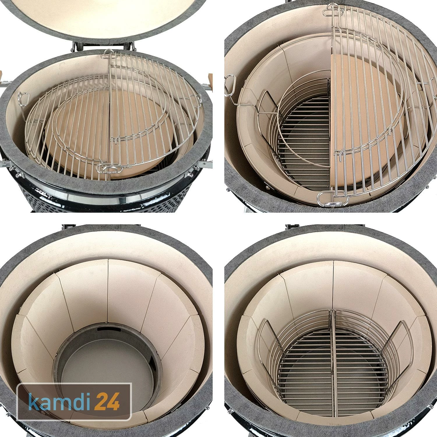 Das mehrstufige Garsystem von Grill Guru ermöglicht es Ihnen, sowohl direkt als auch indirekt zu grillen. Sie können so problemlos unterschiedliche Gerichte parallel zubereiten. Das System besteht aus einer Edelstahlhalterung sowie zwei separaten halbrunden Tellern aus Cordierit-Keramik.