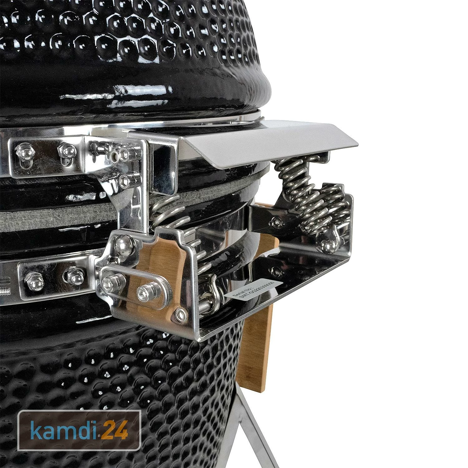 Der Kamado von Grill Guru ist mit hochwertigen Seitentischen aus Bambus-Holz ausgestattet. Diese bieten die Möglichkeit Grillzubehör wie Gewürze, Grillbesteck oder Geschirr bequem abzustellen. Werden die Seitentische nicht benötigt, können diese ganz einfach zugeklappt werden.
