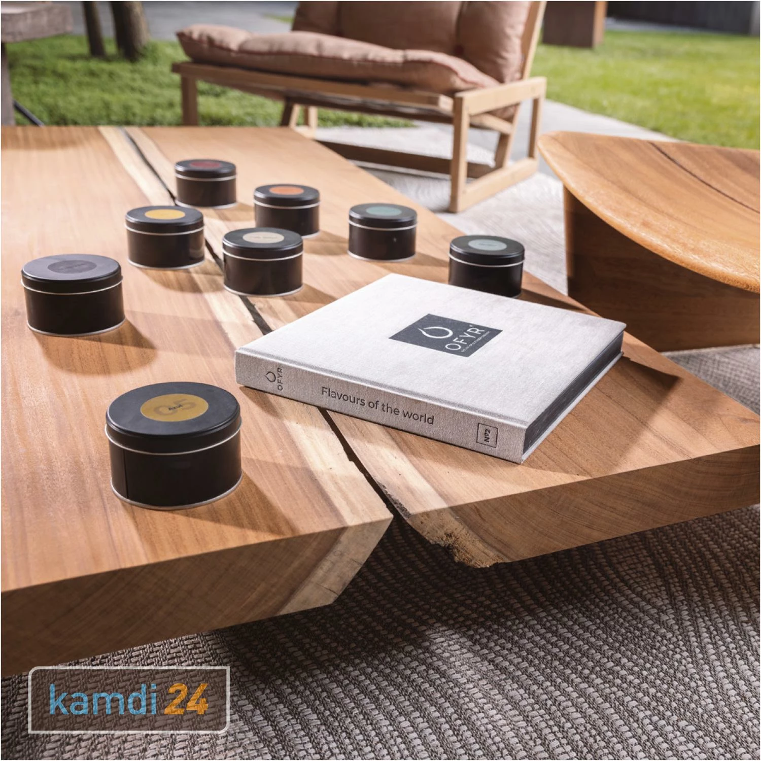 Die für das Outdoor Cooking sind sehr vielfältig und reichen vom Fingerfood oder von der Vorspeise bis hin zum Dessert. Außerdem werden im Kochbuch gegeben und die acht OFYR-Gewürzmischungen vorgestellt, die vom Profikoch Guy Weyts sorgfältig zusammengestellt wurden.