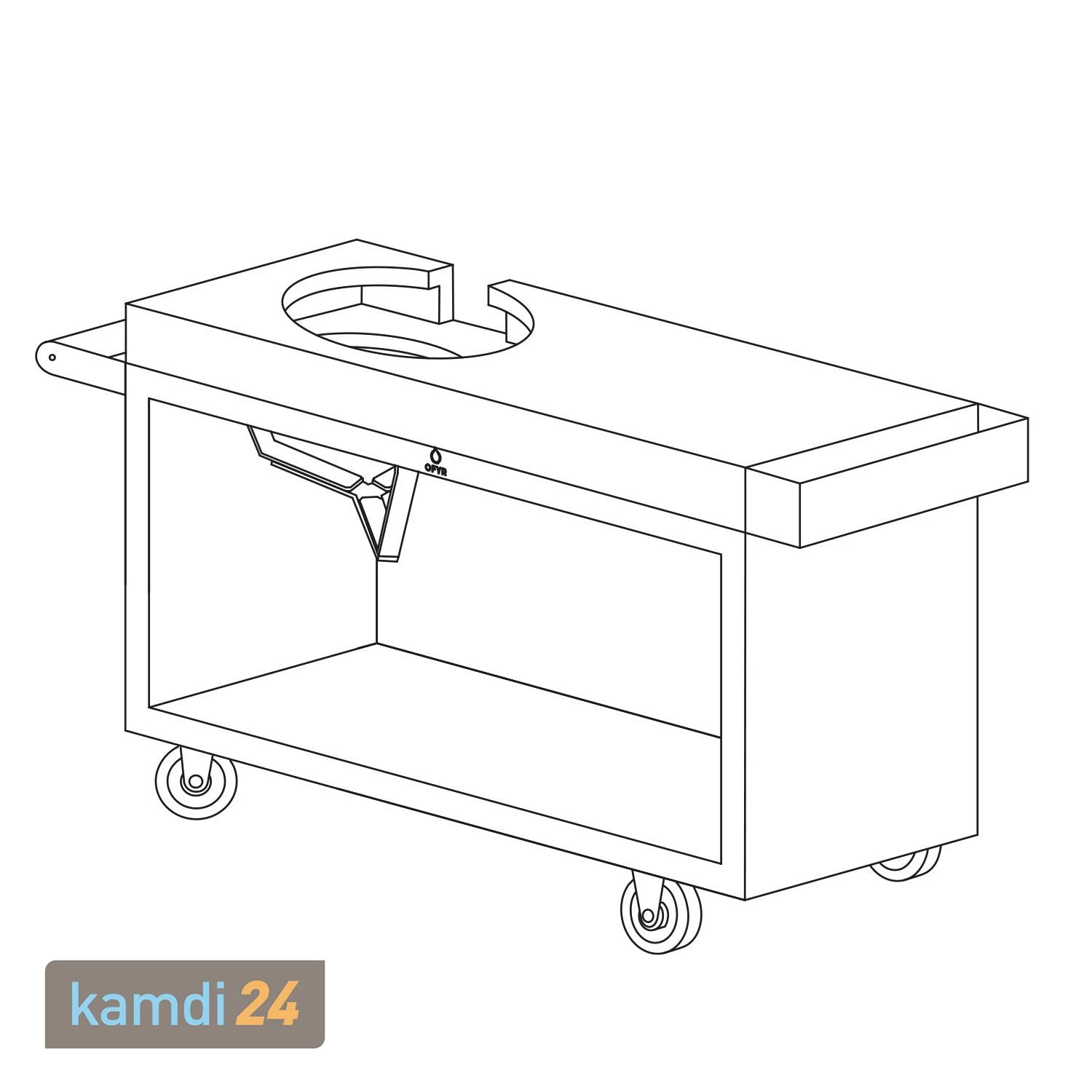 Als besonderes Merkmal zeichnet sich ein seitlicher Griff zum besseren Bewegen sowie als Ablage für Geschirrtücher und Grillbesteck aus. Zudem befinden sich unten vier Räder, mit denen Sie den Sockel leicht an verschiedenen Stellen im Garten platzieren können. Beachten Sie, dass der Sockel mit Kamado sehr schwer zu bewegen ist.