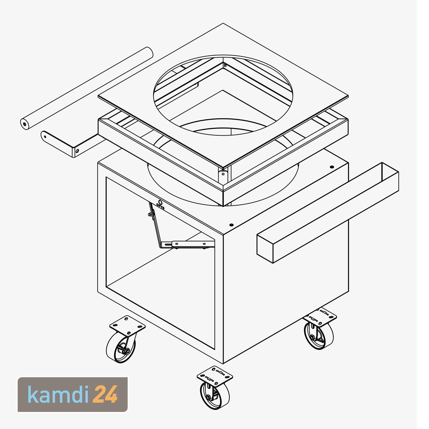Als besonderes Merkmal zeichnet sich ein seitlicher Griff zum besseren Bewegen sowie als Ablage für Geschirrtücher und Grillbesteck aus. Zudem befinden sich unten vier Räder, mit denen du den Sockel leicht an verschiedenen Stellen im Garten platzieren kannst. Beachte, dass der Sockel mit Kamado sehr schwer zu bewegen ist.