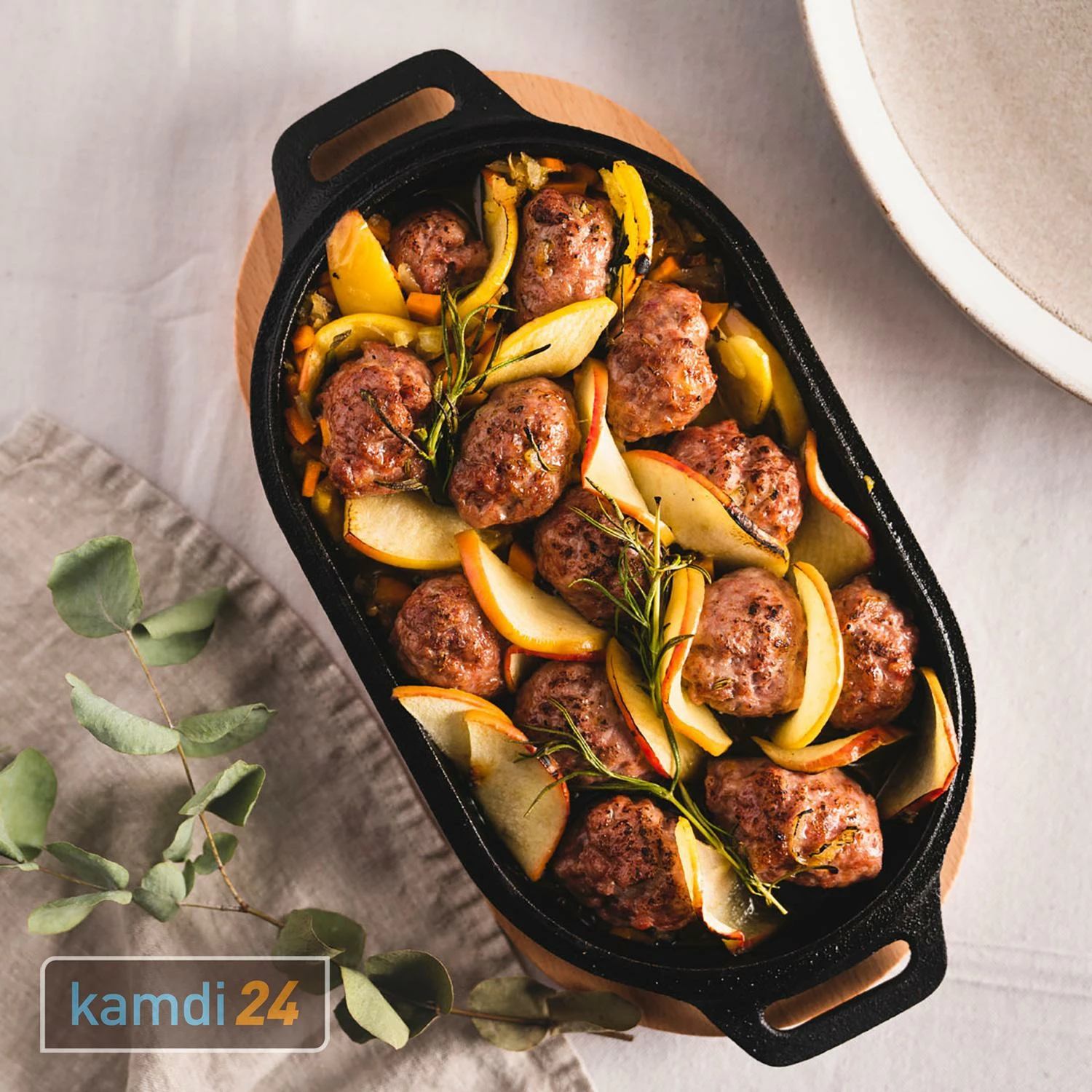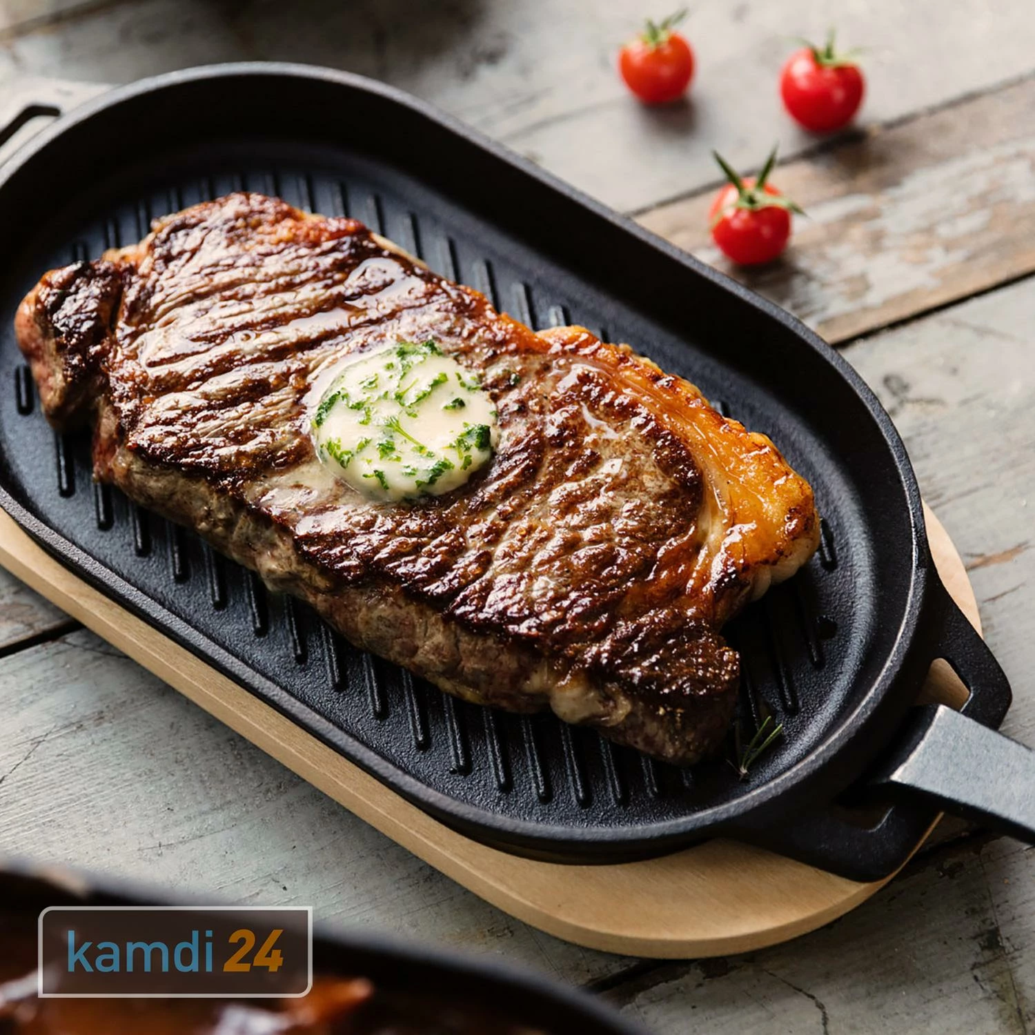 Bei der von aus unserem handelt es sich um eine . Die gusseiserne Pfanne weist markante Erhöhungen auf und sorgt so für ein perfektes Branding. Besonders praktisch ist der abnehmbare Griff. Mit diesem können Sie die im Ofen platzieren und ohne Angst vor Verbrennungen wieder entnehmen. Zum Abstellen und Servieren der Pfanne dient der Untersetzer aus Holz.