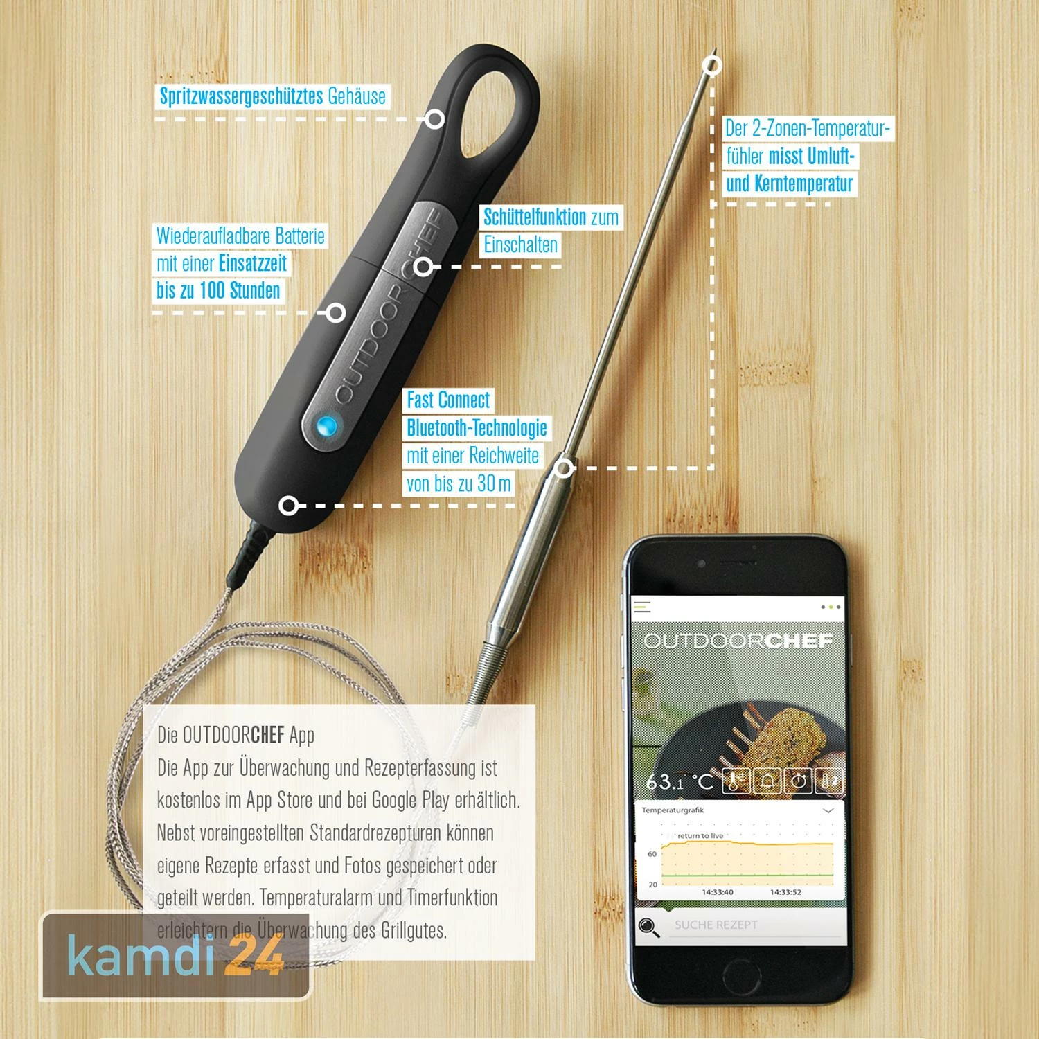 Der ist ein multifunktionales mit moderner Bluetooth-Technologie. Es misst die Umluft- und Kerntemperatur, die Sie ganz bequem auf Ihrem Smartphone oder Tablet überwachen können.