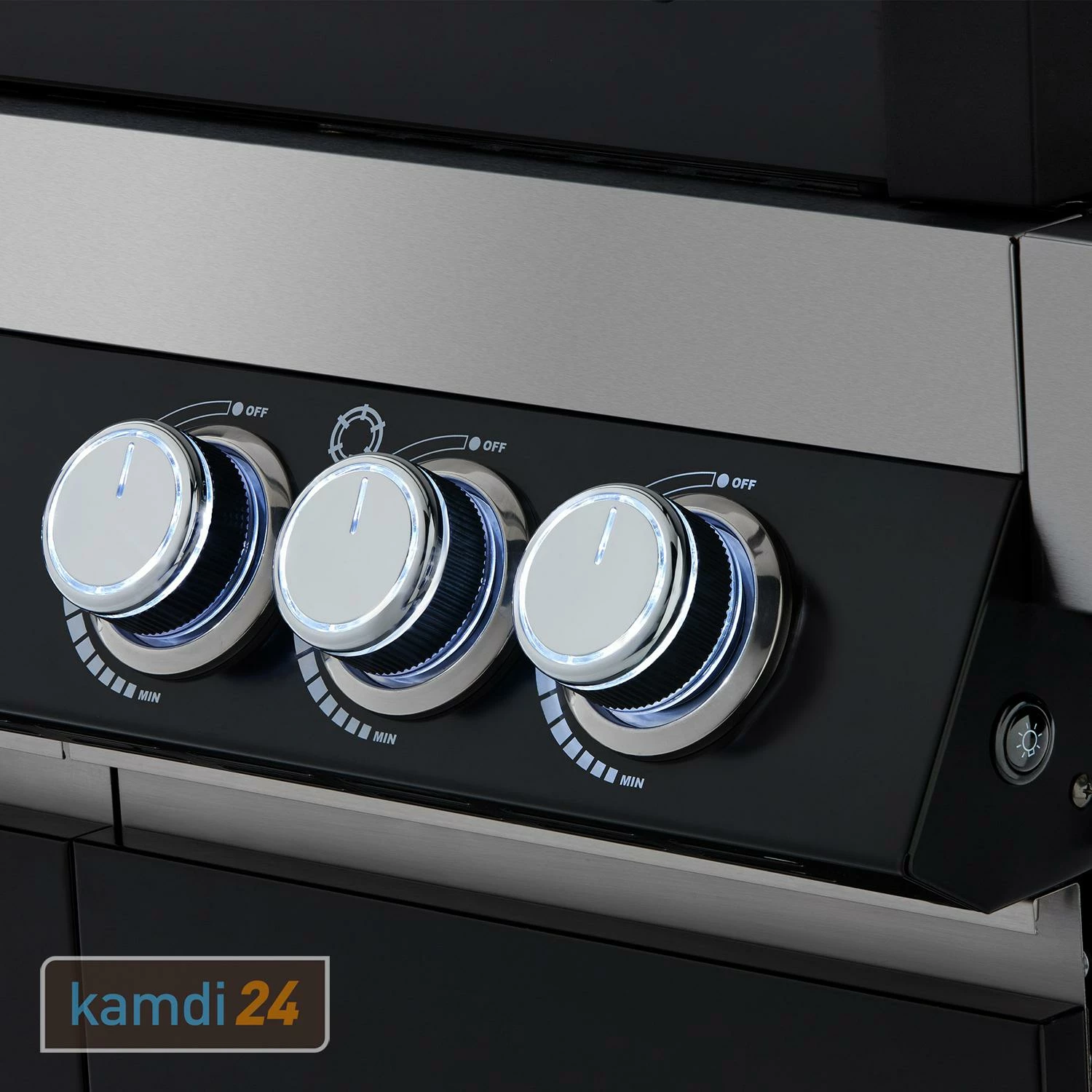 Die Temperaturregulierung erfolgt beim über beleuchtete Drehknöpfe. Sofern ein Brenner nicht in Benutzung ist leuchten die Knöpfe blau. Wird ein Brenner in Betrieb genommen wechselt die Farbe auf rot. Sie können also immer zuverlässig an der Farbe des Drehknopfes erkennen, ob ein Brenner eingeschaltet ist oder nicht.