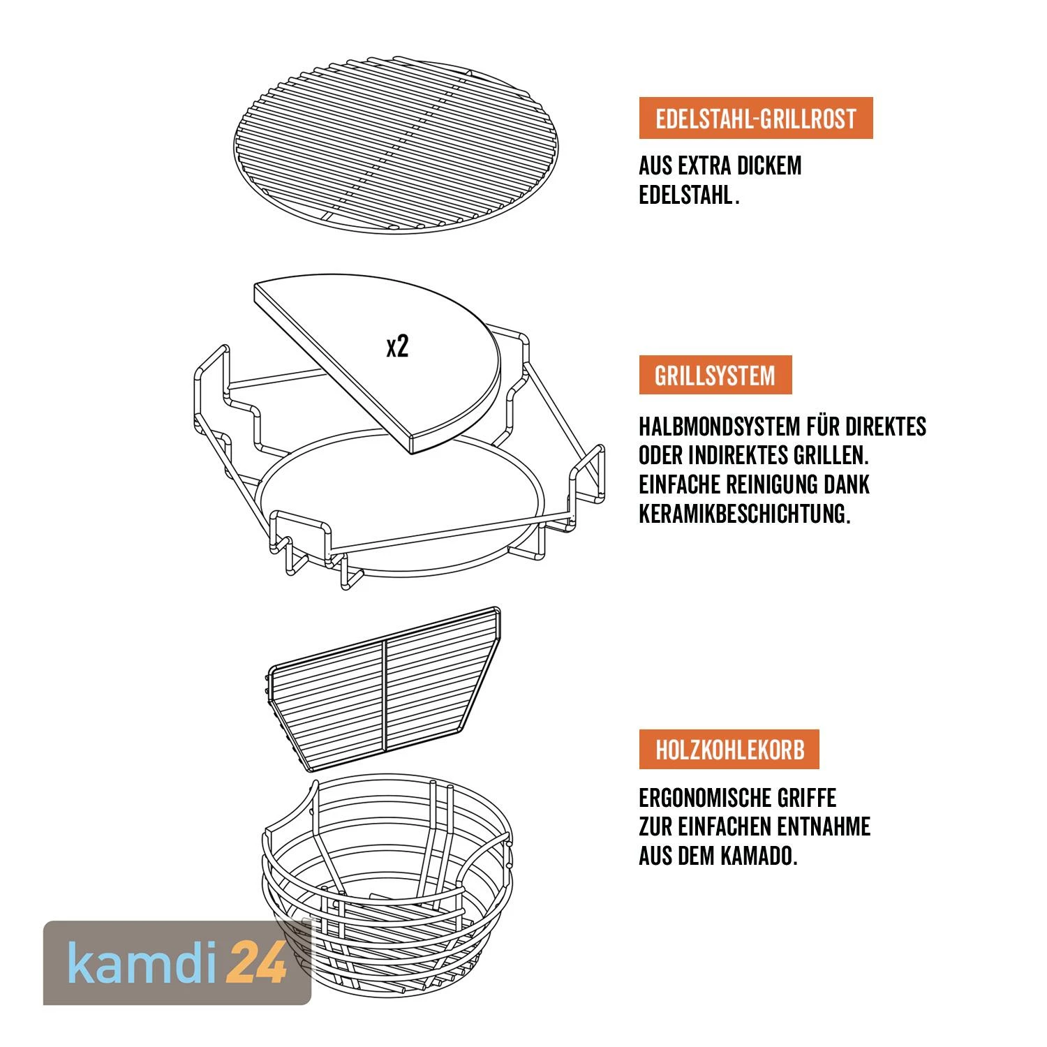 Standardmäßig ist der Grill mit zwei schwarz beschichteten Wärmedeflektoren und dem dazu passenden Stahlgestell ausgestattet. Die halbmondförmigen Wärmeplatten ermöglichen das indirekte Grillen mit dem Keramikgrill. Zudem bietet das Gestell zahlreiche weitere Einsatzmöglichkeiten mit dem passenden von The Bastard, wie beispielsweise dem Wok oder weiteren Grillrosten.