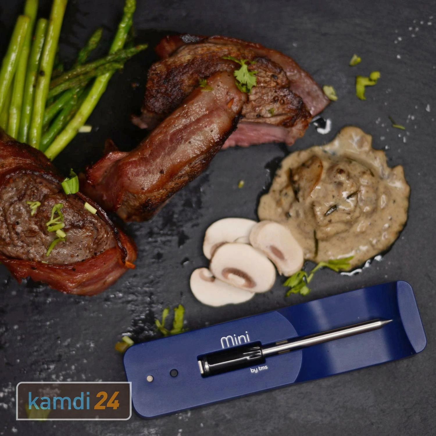 Das derzeit kompakteste Bluetooth-Fleischthermometer erhalten Sie mit dem MeatStick Mini by TMS. Es eignet sich aufgrund seiner Größe besonders für kleinere Fleischstücke oder die Zubereitung von Fleisch in Pfanne oder Fritteuse. Der Sensor misst dabei Kerntemperaturen bis 85 °C bei einer Akkulaufzeit von 8 Stunden. Auch die kleine Version lässt sich problemlos über die App steuern und kann in Kombination mit dem klassischen MeatStick eingesetzt werden. Sie erhalten MeatStick Mini by TMS ebenfalls als Xtender-Version und zusätzlich mit WiFi Bridge. Wählen Sie Ihr passendes Set über das Varianten-Menü.